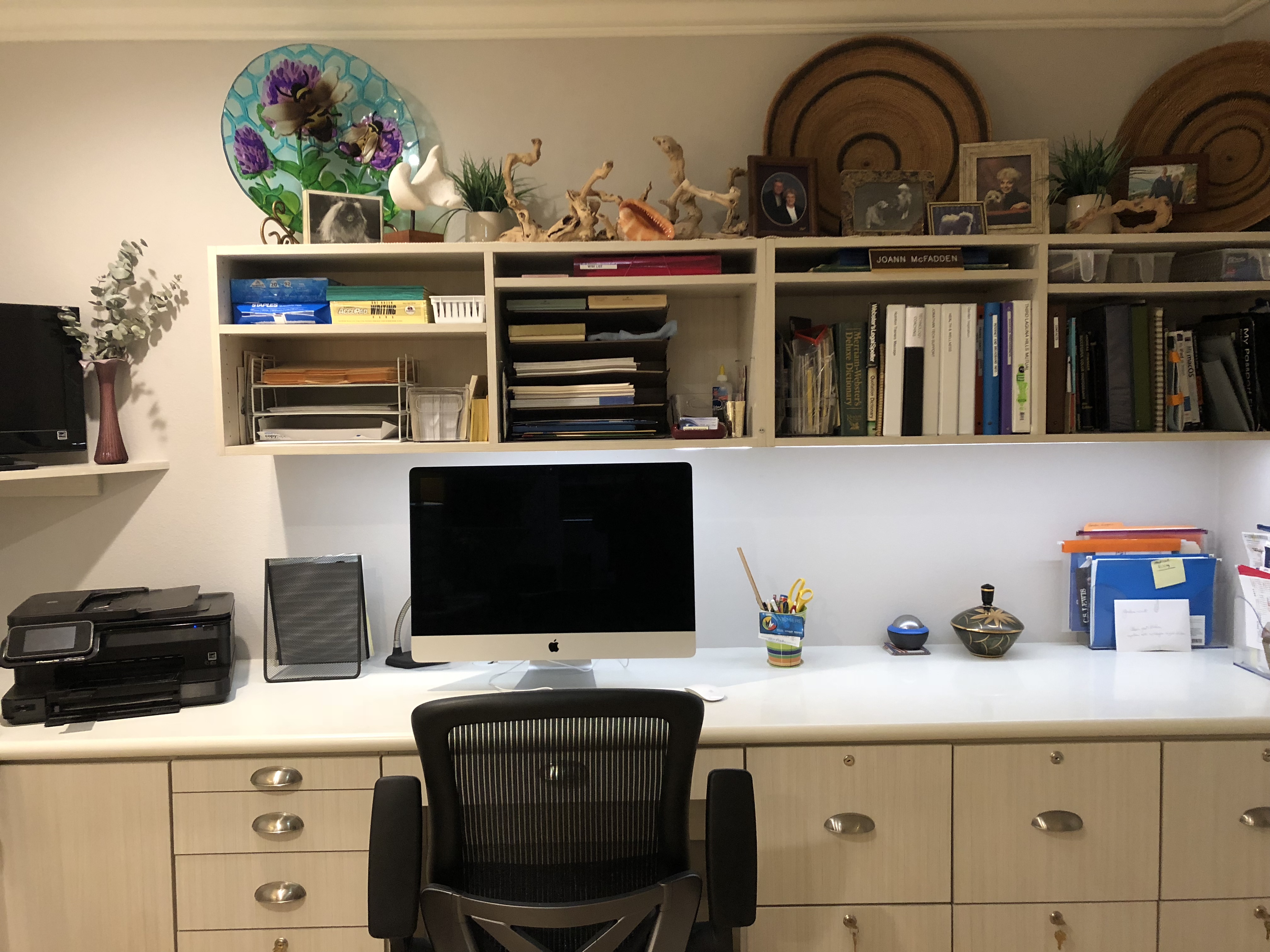 A well-designed home office space provides ample room and home office storage to get work done efficiently by having the right combination of lower desk cabinets and upper storage cabinets for easy access to home office supplies, plenty of work surfaces to spread out, task lighting customized to your work needs, and file drawers to easily access important documents and office files.