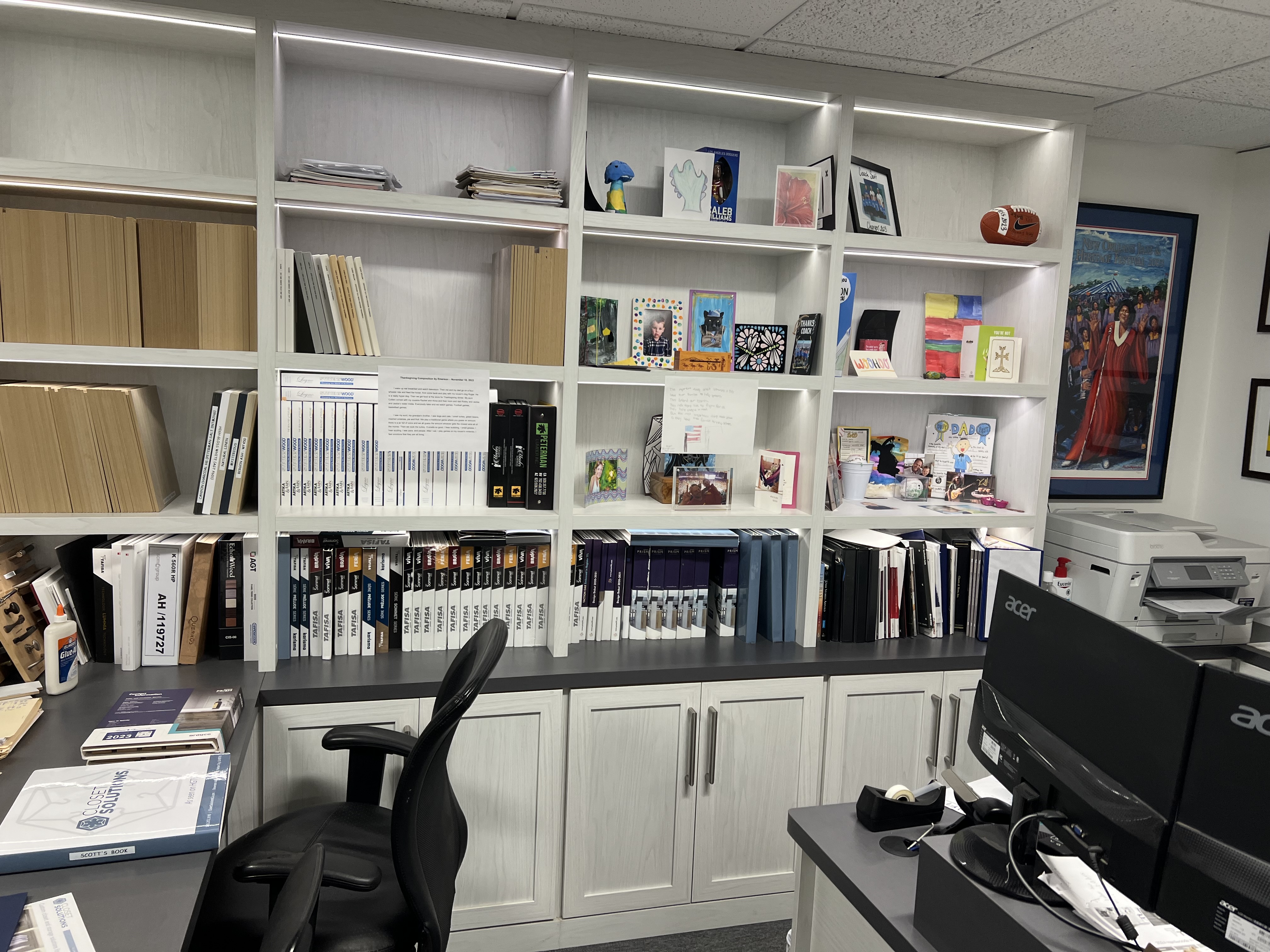 Showcase your home office and make your workspace more functional including custom-designed bookshelves, integrated lighting, power ports and charting stations, keyboard trays and sliding drawers, floating shelves and stylish hardware to embellish your home office space to suit your style.